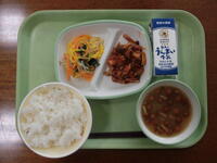今日の給食(ご飯、牛乳、豆腐ハンバーグデミきのこソース、彩野菜のナムル、なめこ汁)