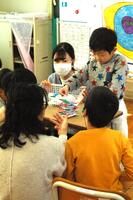 小学部2年生は、盲学校のお友達と交流しました。自己紹介のあとで、それぞれが持ち寄ったゲームで遊びます。聾学校の児童が用意したのは、「カメタワー」。カラフルに色を塗ったカメを交互に積み上げていきます。カメのお腹にはペットボトルのキャップがついているので、上手く重ねないとタワーが倒れてしまいます。