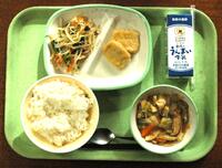 今日の給食(ご飯、牛乳、八宝菜、豆腐ナゲット、もやしとほうれん草のナムル)