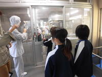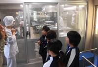 こちらは小学部4年生の給食室見学。本校は、自校給食。調理室を備えていて、全校生徒のお昼と寄宿舎生の朝食・夕食を調理しています。いつも熱々の給食をいただいています。今日の給食は、発芽玄米入りご飯、牛乳、上州棒餃子、麻婆豆腐、もやしとキュウリの中華和えです。子供たちは、麻婆豆腐を作るところを間近で見ることができました。