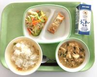 今日の給食(ごはん、牛乳、焼き餃子、麻婆豆腐、春雨サラダ)