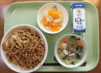 今日の給食 (ソース焼きそば、牛乳、中華スープ、フルーツヨーグルト)