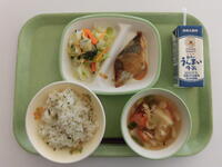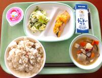 今日の給食(菜飯、牛乳、さわらの西京焼き、すいとん、キャベツと小松菜の和え物)