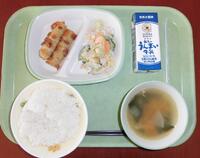 今日の給食(ご飯、牛乳、鶏肉のマヨネーズソース、昆布和え、白菜としめじのみそ汁。)