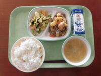 今日の給食(ご飯、牛乳、肉団子の甘酢野菜あんかけ、いそか和え、飛鳥汁)
