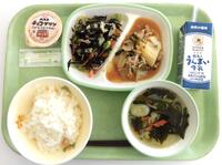 18日の給食(ご飯、牛乳、とり肉の甘酢野菜あんかけ、こんにゃくとわかめのサラダ、五目ワンタンスープ)