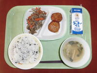 17日の給食(わかめご飯、牛乳、とり肉と野菜のつくね、上州きんぴら、小松菜と油揚げのみそ汁)