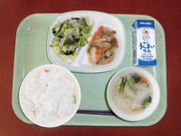 3日の給食は、ご飯、牛乳、いわしのごま味噌煮、白菜と竹輪の和えもの、けんちん汁でした。