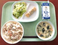 今日の給食 (発芽玄米入りご飯、牛乳、八宝菜、春巻、春雨サラダ)