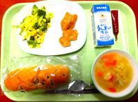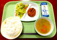 昨日の給食(ご飯、牛乳、メンチカツ、香味和え、根菜汁)
