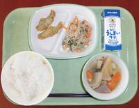 今日の給食(有機栽培米、牛乳、あじフリッター、関東煮、水菜とささみのごま和え)