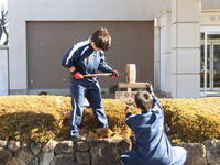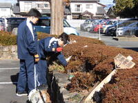 小学部生がみんなで、小学部棟前の落ち葉拾いをおこなぃました。本校は庭木が多く、落ち葉の処理もたいへんです。箒で枯葉を集める子、集めた枯葉を袋に詰める子、みんな積極的に手を動かしていました。箕(大きなチリトリ)をもった子の中には、ブルトーザーのように箕を使って枯葉を動きながら集める子もいました。一人が始めると、あちらこちらで真似をして、ブルトーザーのように動きまわる子が出てきました。
