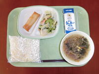 今日の給食(しょうゆラーメン、牛乳、春巻、海藻サラダ)