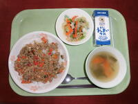 今日の給食(麦ごはん、牛乳、ガパオライスの具、小松菜とツナのサラダ、かぶのコンソメスープ)