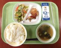 今日の給食(ご飯、牛乳、とりの照り焼き、昆布和え、小松菜と油揚げのみそ汁)