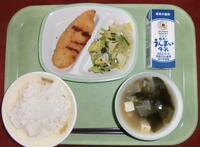 今日の給食(ご飯、牛乳、白身魚のフライ、キャベツとカニカマの和え物、わかめと豆腐のみそ汁)