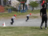 校庭では、このところ体力測定で多くの学年が短距離走のタイムをとったり、ボールを投げた距離を測ったりしています。今日は、3・4年生がタイムを計っていました。今年は体育祭がある年なので、格好よく走る姿が見せられますね。