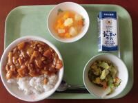 今日の給食(ご飯、牛乳、焼き餃子、五目豆腐、もやしときゅうりの中華和え)